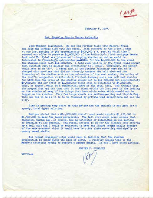 February 6, 1957 Internal memo from Walter O'Malley Link |